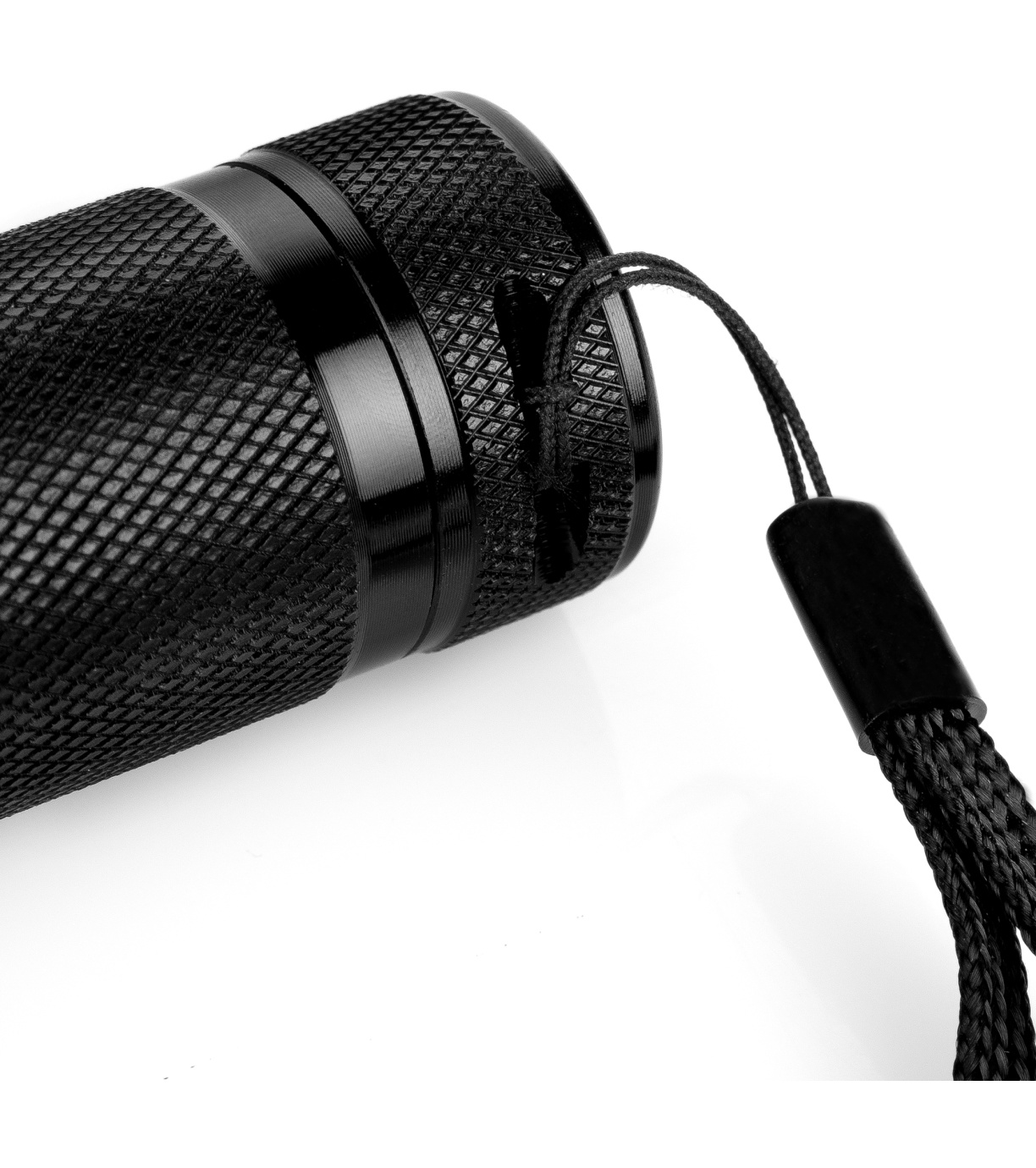 baterka s poutkem na ruku: hliník, ABS, silikonový vypínač, polypropylenové poutko
