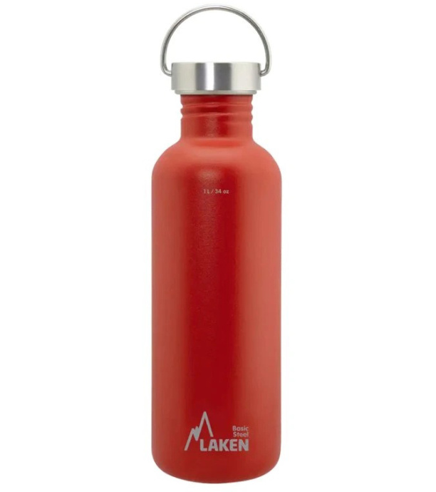 Moderní jednoplášťová láhev LAKEN z nerezové oceli 18/8, která zajišťuje naprostou bezpečnost nápoje.